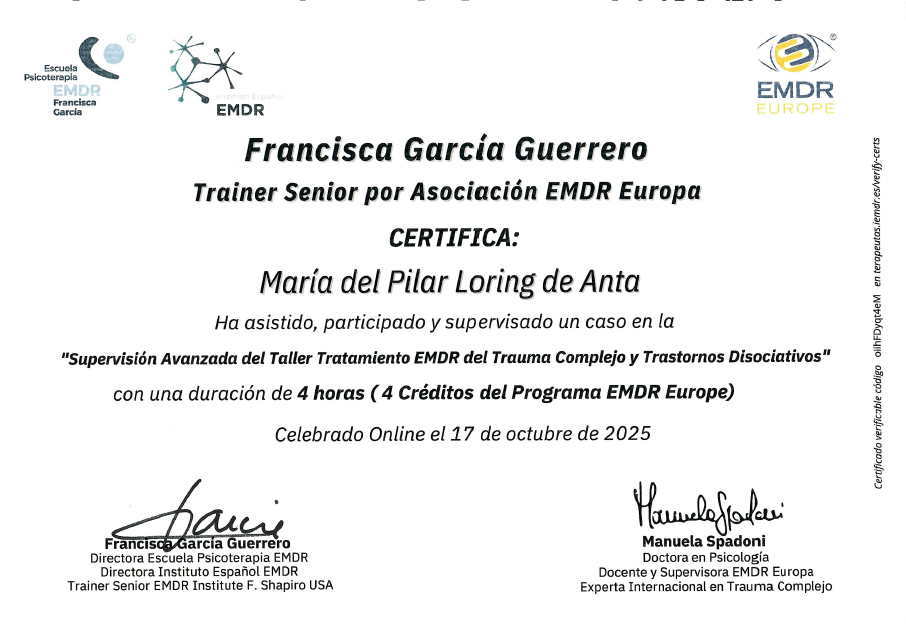 La formación en en abordaje de EMDR la he adquirido desde el año 2024 en los Niveles I y II y cursos de especialización de trauma complejo con las supervisiones correspondientes. Mis estudios especializados los certifica el Instituto Español de EMDR. Estoy en la Asociación de EMDR España y cuento con aval internacional para ejercer esta práctica terapéutica tan eficiente para los procesos traumáticos de la historia personal de cada persona.